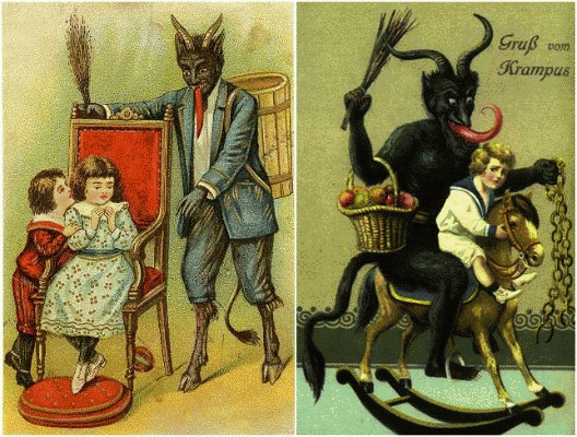 Старинная новогодняя открытка. К послушным детям приходит Святой Николай (он же Дед Мороз), а к непослушным – Крампус. Пучок веток в руках Крампуса – совсем не метла без ручки. Это розга.