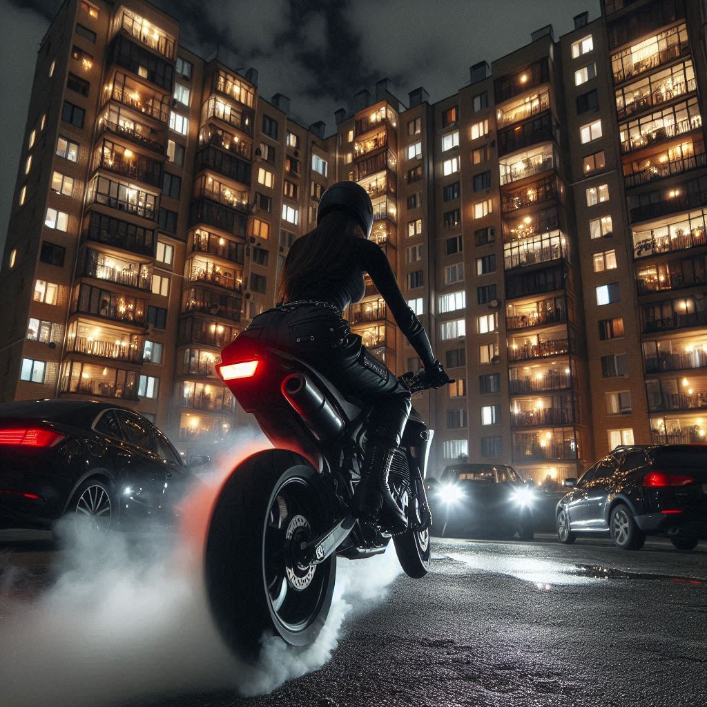 Выкатила зверя в подъезд, спустила по лестнице и вышла на улицу. Сев в седло, ощутила прилив адреналина. Одела шлем, повернула ключ – мотор завёлся шелестя. Немного покрутила ручку газа прогревая мотор, зажав сцепление левой рукой, носком ноги нажала первую передачу. Зверь немного дёрнулся, приводная цепь натянулась, тормоз первой рукой зажат. И газ до отсечки. Дроссельная заслонка провернулась на девяносто градусов, всасывая огромный поток воздуха. Заднее колесо начало дико вращаться, издавая визг и создавая сизый дым позади. Заднюю часть начало водить то вправо, то влево. Сглотнув слюну, отпустила тормоз. Дикий зверь был выпущен на волю, задрав переднее колесо, рванул на заднем.