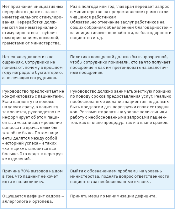 В целом ряд указанных проблем помогло бы решить создание соответствующих регламентов по работе с обратной связью от сотрудников в организации. Причем важно, чтобы данные регламенты учитывали интересы всех заинтересованных сторон (например, с одной стороны, не позволяли бы предоставлять руководству «отписки» в случае реальных проблем, а с другой стороны, не давали недобросовестным сотрудникам использовать обратную связь как инструмент достижения личных целей).