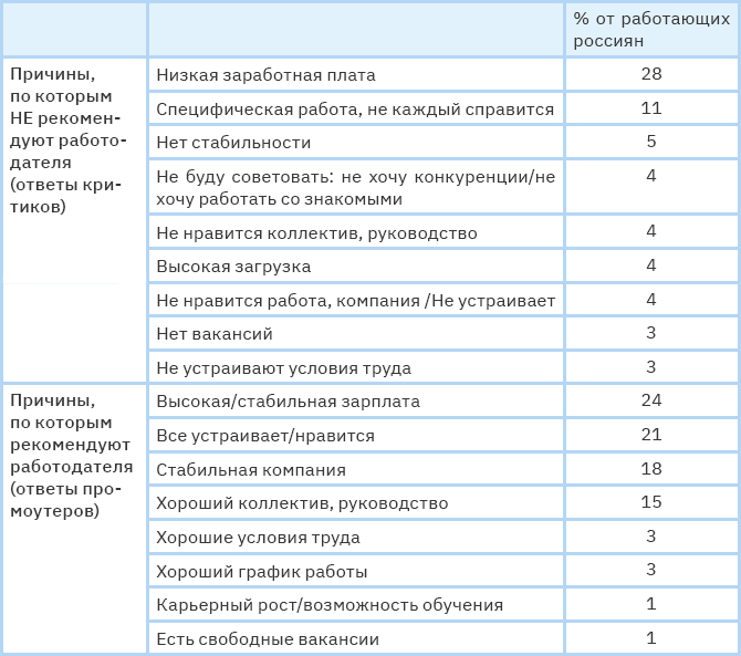 Таблица 1. Причины (не)лояльности персонала, ответы на вопрос «Скажите, почему Вы поставили именно такую оценку? С чем это связано?», в % от всех работающих россиян, открытый вопрос, респонденты отвечали на вопрос в свободной форме, не выбирая из предложенных вариантов ответа[232]