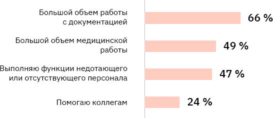 Рисунок 3. Распределение ответов на вопрос «С чем связана ваша загруженность на работе?», в % от ответивших на вопрос. Сумма ответов превышает 100 %, так как вопрос допускал множественный выбор. Из графика исключен вариант ответа «Другое», указанный менее чем 5 % респондентов[243].