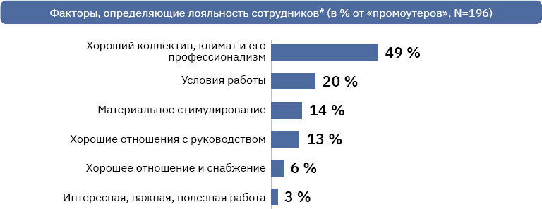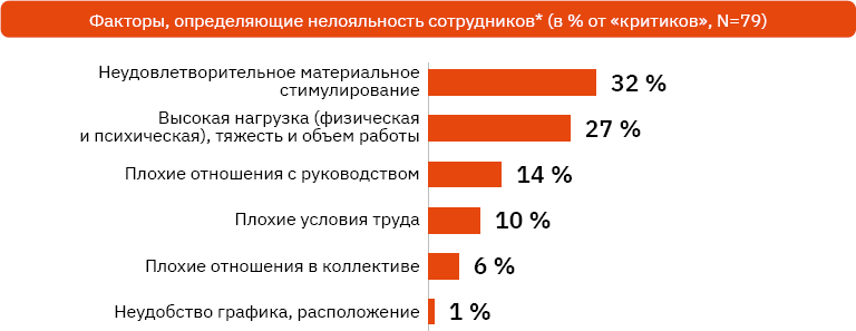 Исследование показало, что вне зависимости от типа организации и должности сотрудников среди положительных стимулов, оказывающих влияние на лояльность, самым упоминаемым выступили «отношения в коллективе», на втором месте почти во всех организациях была хорошая или стабильная зарплата. Что касается самых упоминаемых негативных для лояльности факторов, это в первую очередь «большой объем работы/нагрузка».