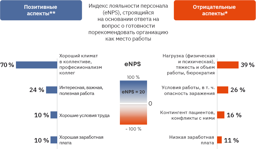 Стоит отметить, что за исключением проведенных ГБУ «НИИОЗММ ДЗМ» исследований, в нашей стране исследования лояльности медицинского персонала в рамках методики eNPS в открытом доступе также являются единичными. Среди найденных исследований, приведенных в публикации, было найдено всего два: опрос 60 сотрудников стоматологической поликлиники Красноярского государственного медицинского университета (eNPS = –11,4)[237] и 65 сотрудников трех частных клиник в Набережных Челнах[238]. Причем в последнем исследовании самого значения eNPS не приводится и факторы лояльности были измерены с использованием иного инструментария – не открытыми, а закрытыми вопросами. Указанные исследования не формируют общей картины, демонстрируют специфические кейсы, поэтому далее они рассмотрены не будут.