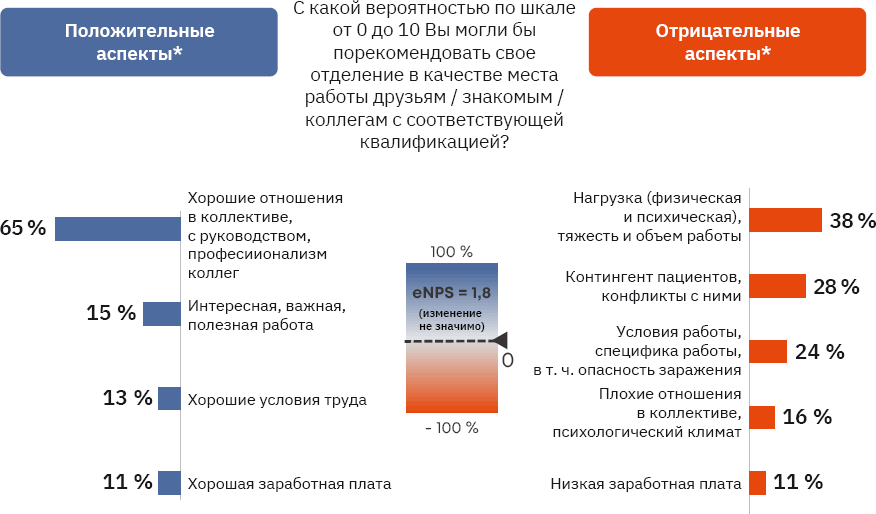 По итогам исследования, среднее значение составило eNPS=9. Между подгруппами медицинских работников были обнаружены различия в оценках: более лояльными оказались врачи – их средняя оценка eNPS=17, в то время как оценка среднего медперсонала была существенно ниже, eNPS=1.