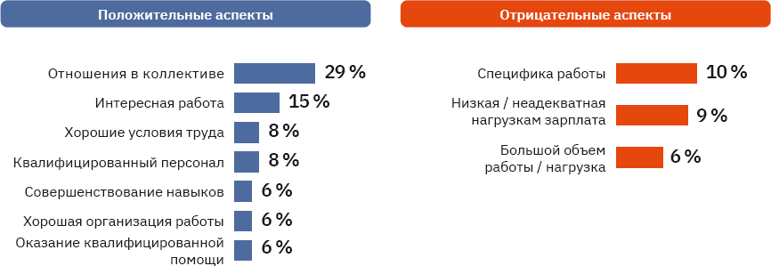 Среди компонентов психоэмоциональных условий труда сотрудники чаще всего упоминали такой фактор, как отношения в коллективе (32 %). Другие компоненты отмечались в 4 и более раз реже (работа как самореализация, отношения с руководством, пациентами, восприятие работы как интересной, коллег как профессиональных, общий эмоциональный фон). Среди негативных проявлений психоэмоциональных условий труда в 4 и более раз чаще упоминались характеристики общего эмоционального фона (9 %), такие, как эмоциональная усталость, которая в т. ч. вызывается работой со «сложными» пациентами. В целом фактор психоэмоциональных условий труда в ответах респондентов намного чаще фигурирует со знаком «плюс», чем как фактор нелояльности. Сестринский персонал значимо чаще, чем врачебный, упоминал психоэмоциональные условия труда, что можно связать в том числе с большей их приверженностью «командной работе» в коллективе.