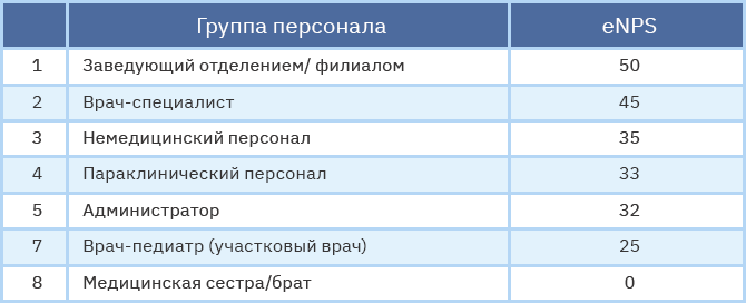 Рассматривая лояльность по подразделениям организации (головное здание и филиалы), мы видели, что в каждом подразделении среди самых лояльных групп были врачи-специалисты, а среди самых нелояльных – медицинские сестры. В целом по организации самые лояльные – заведующие отделениями и филиалами (eNPS=50), а самые нелояльные – сестринский персонал (eNPS=0), при этом врачи опять же лояльнее медсестер (Таблица 2).