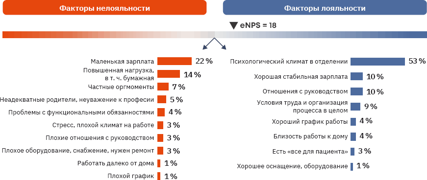 Наконец, последний кейс медицинской организации, который мы приведем, посвящен детской (неспециализированной) поликлинике. На выборке из 331 сотрудника поликлиники был проведен сплошной опрос, который показал уровень лояльности работников к организации eNPS=18 (2020)[254].