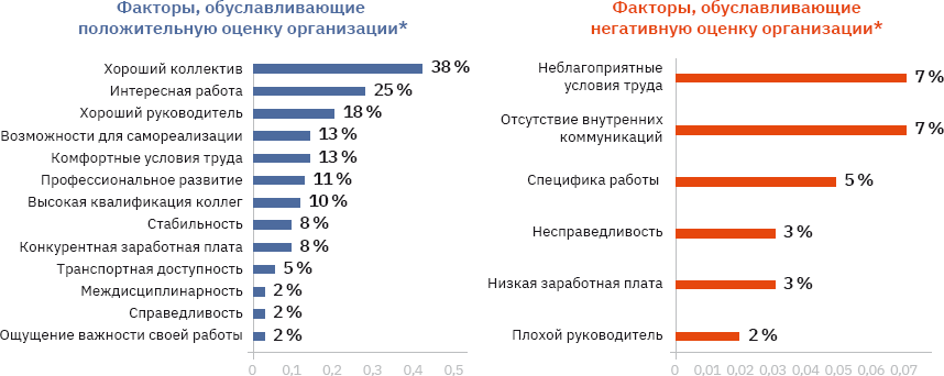 В целом исследование показало высокий уровень лояльности персонала, eNPS=35, только один из отделов института имел отрицательный показатель лояльности (eNPS<0). Обнаруженные факторы лояльности приведены на Рисунке 10.