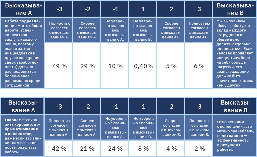 Одним из факторов, предрасполагающих к сплочению сотрудников, можно назвать коллективистские установки. Мы видим, что большая часть опрошенных явно демонстрирует ценности, смещенные к полюсу «коллективизма» (Рисунок 11). С одной стороны, такого рода установки, по-видимому, будут способствовать сплочению, а через него – лояльности (через улучшение климата в коллективе). С другой стороны, они несут риски того, что в излишне «коллективистских» коллективах будет сложно найти инициативных, ориентированных на задачи лидеров.