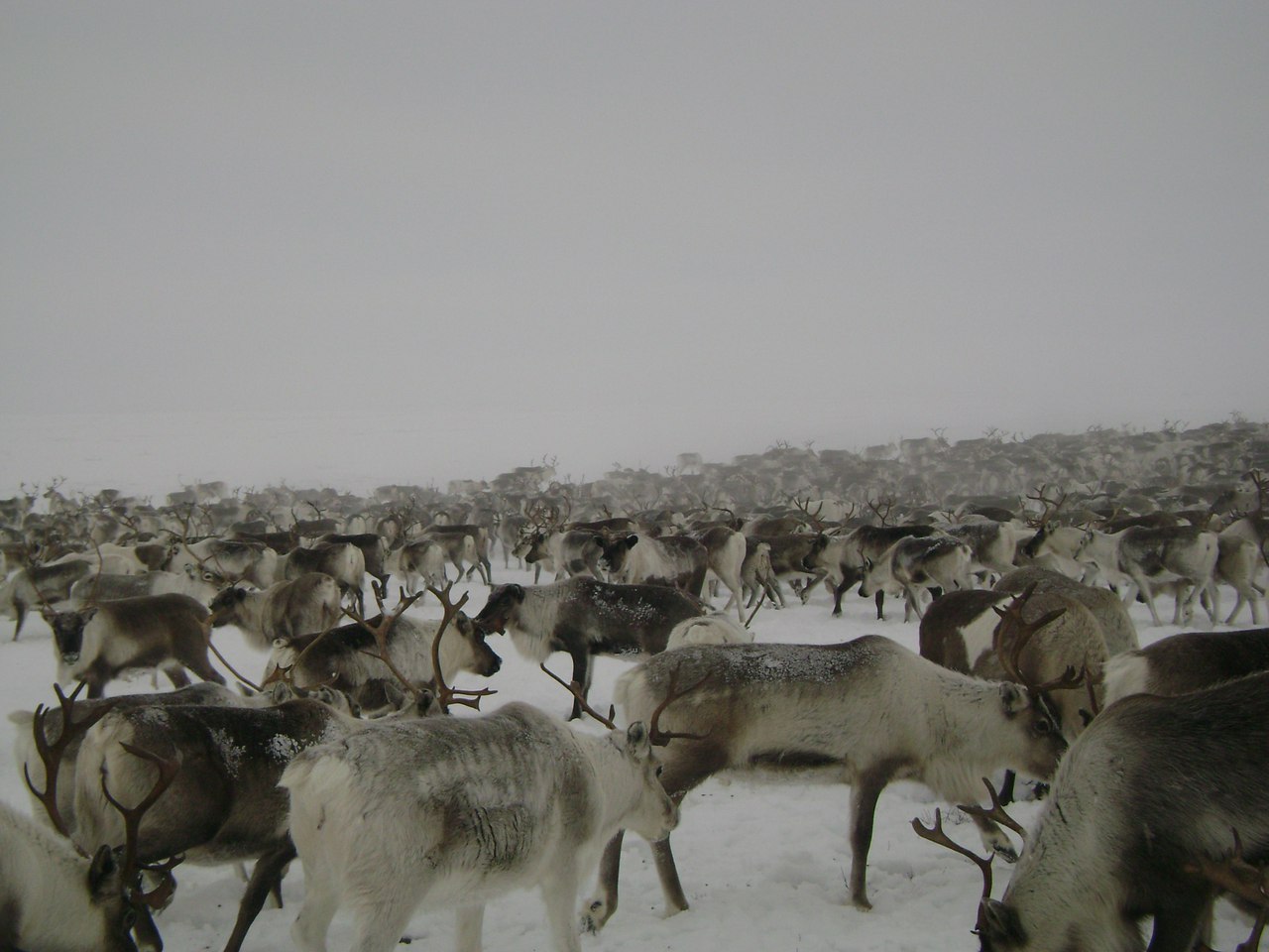 Фото Леонида Лагейского. Оленье стадо на заснеженной тундре.