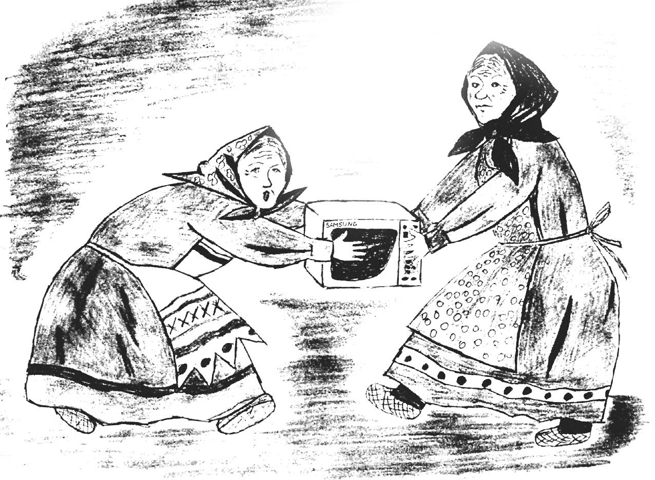 Тамара Леонтьевна и Марина Павловна, не здороваясь и не оглядываясь по сторонам, быстрыми шагами устремились к микроволновой печи. Лишь возложив на нее свои руки, каждая из соседок обратила внимание, что на печи греются уже не две ладони, а четыре. Тут они осознали присутствие друг друга.