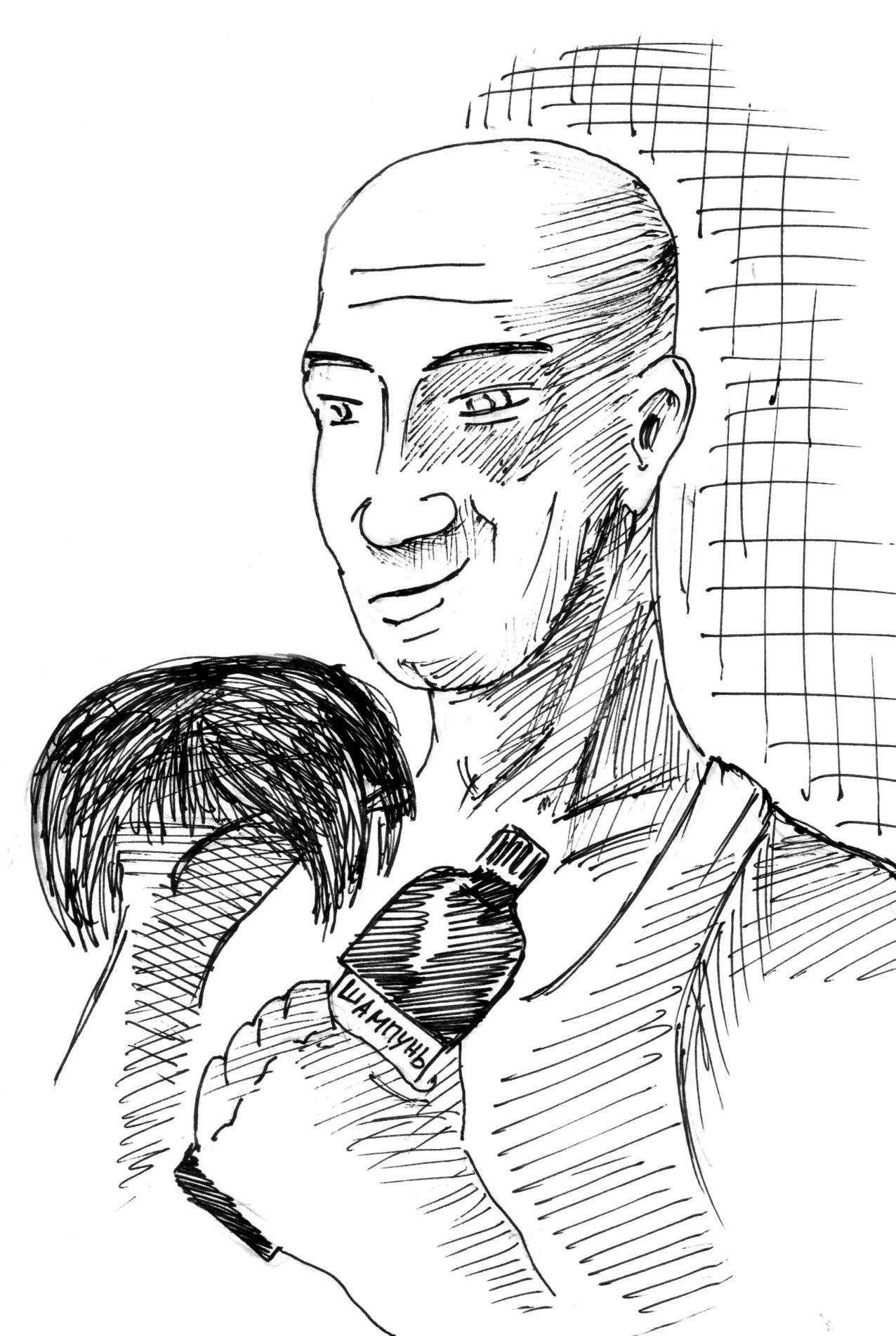 Обнажается гладкая и блестящая стопроцентная лысина без единого волоска. С чувством превосходства и глубочайшего самодовольства горожанин уверенно предлагает зрителям: