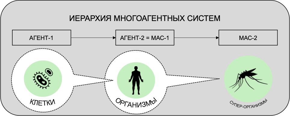 Интерес представляет то, что обычные биологические организмы (многоклеточные) можно рассматривать как многоагентные системы, то есть супер-организмы, если отдельными акторами в них предполагать клетки. Другими словами, тело человека – это многоагентная система, агентами в которой выступают отдельные клетки во всём их разнообразии. При этом между несколькими десятками триллионов клеток, составляющих наш организм, имеется несколько систем сигнализации, которые объединяются термином «нейрогуморальная регуляция». Это значит, что клетки-агенты в составе многоагентной системы организма активно взаимодействуют друг с другом, точно также решая большое количество задач, которые не могут быть решены отдельными клетками – ровно так ведут себя и супер-организмы, то есть многоагентные системы, составленные из отдельных организмов.
