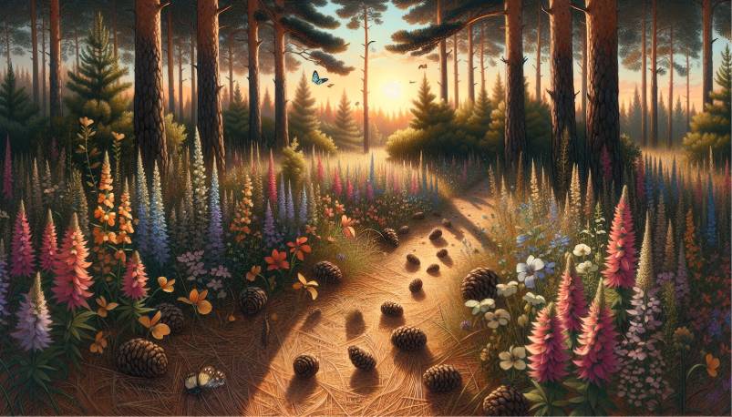 Июньское солнце уже жгло, так что я пошёл в наш сосновый бор, хотя там и не было той спасительной тени, которая был бы нужна в такой день. Я побродил по пружинящей хвое, набрал полные карманы сухих шишек, потом пошёл по направлению к урочищу. В урочище всегда было тихо и спокойно, но сегодня что-то было иначе. Я почувствовал лёгкий ветерок, который донёс до меня запах цветущих трав. Следуя за ним, я вышел на небольшую поляну. Поляна оказалась удивительно красивой – разноцветные цветы и бабочки, порхающие над ними, создавали сказочную атмосферу. Странным было то, что я что-то никогда раньше не замечал, что здесь есть такое красивое местечко.