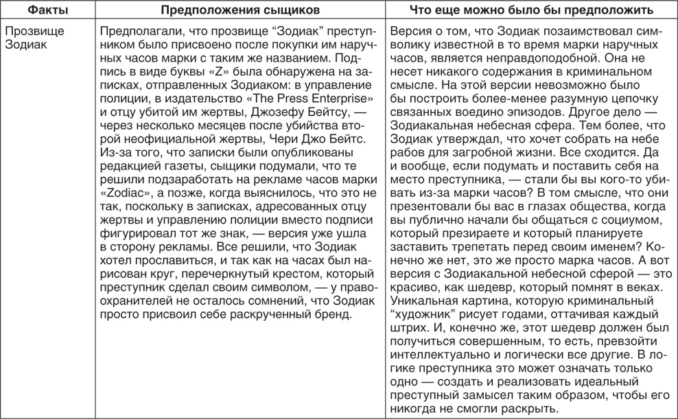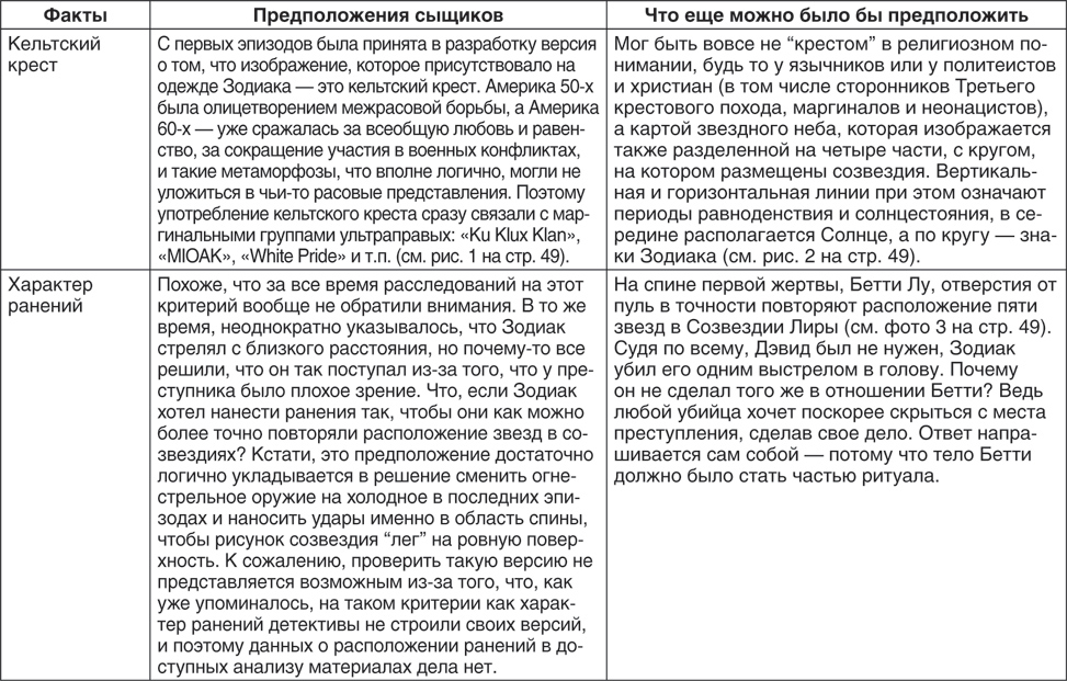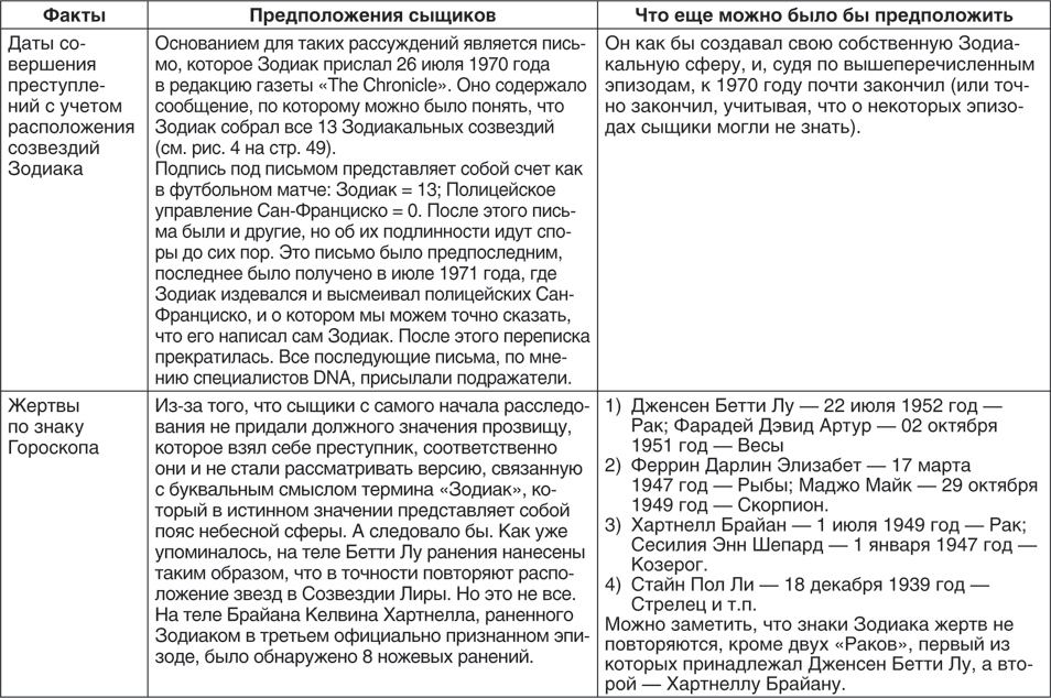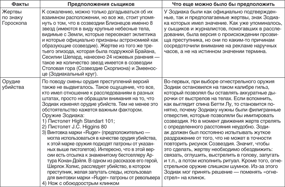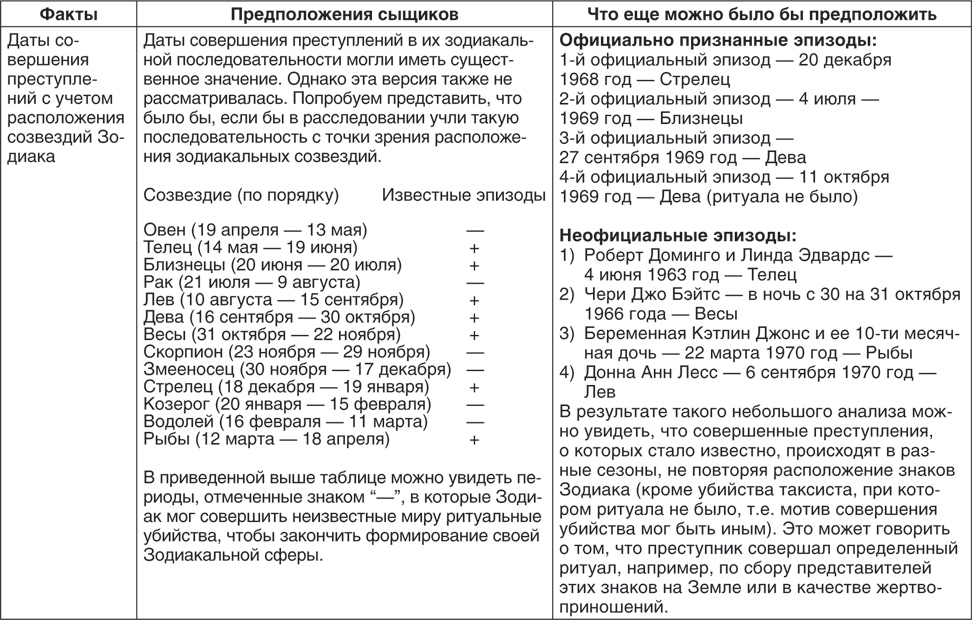 В таблице, приведенной ниже, авторы приглашают читателей рассмотреть и вместе поразмышлять над несколькими интересными версиями, которые могли бы сформировать отдельные линии расследования и войти в профиль Зодиака.