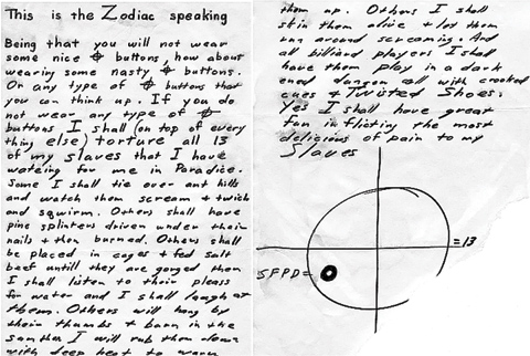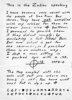 Если все вышеперечисленное можно было подвергнуть анализу, единственно не понятым и неизвестным казался мотив Зодиака. Как-то раз в одном из своих посланий он написал, что собирает «…рабов для загробной жизни». Но никто не знал, стоит ли верить его сообщениям, да и вообще, как к ним относиться. Ведь судя по грамматическим, логическим и стилистическим ошибкам – он был либо не совсем психически здоров, либо находился под воздействием сильнодействующих транквилизаторов, наркотических веществ, либо был иностранцем и не владел английским настолько, чтобы не делать в предложениях ошибок. Было очевидно, что при расследовании допущены непростительные просчеты, и сыщики, имея в руках неопровержимые улики, среди которых, кстати говоря, была даже кровь Зодиака и его отпечатки пальцев, полученные при убийстве таксиста в Сан-Франциско в октябре 1969 года, а также образец его голоса, не смогли идентифицировать и поймать преступника.