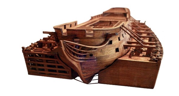 Действительно этот корабль относился к одному из первых произведений русского декоративного искусства в стиле петровского барокко. Носовая часть и корма украшены были скульптурными изображениями и богатою резною работой. Роскошь отделки распространялась так же на элементы палубы и каюты. Резные круглые венки вокруг пушечных портов на бортах, соединяли носовые украшения с кормовыми.