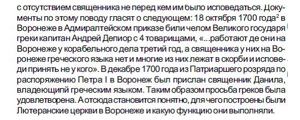 Раньше считалось что Пётр насаждал каноны западной церкви, но это ни так было на самом деле. Эпидемии и болезни на Воронежской земле были очень часты многие иностранцы умирали и из за отсутствия священнослужителей не перед кем им было исповедоваться.