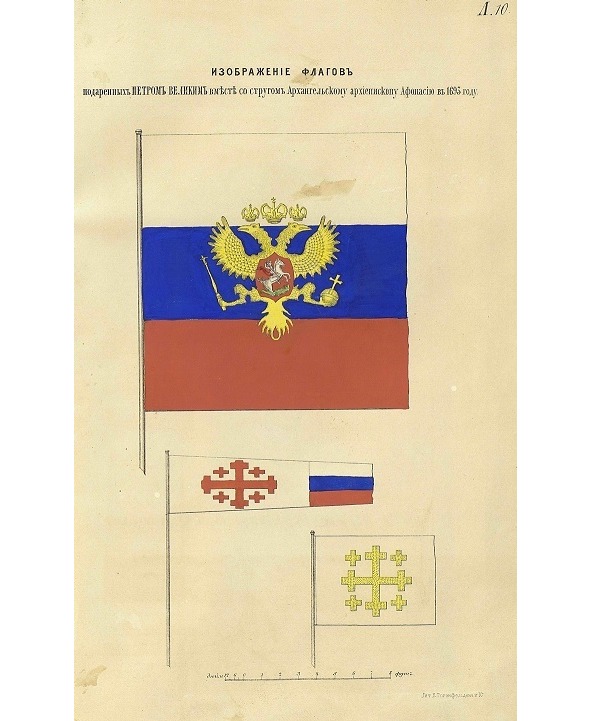 Здесь мы видим, что на флагах присутствует иерусалимский крест. Позже на флагах Русского флота появится Андреевский крест.