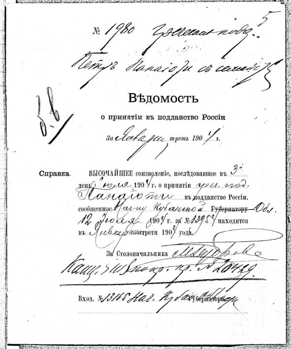 Ведомость о принятии в подданство Петра Панайоти из архивных документов РГИА.