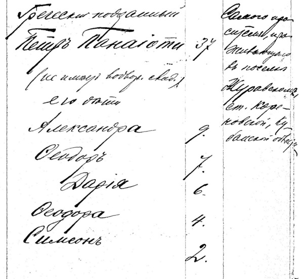 Это были: двоюродный брат Панайоти Иван Петрович с женой Анастасией, Паниота Фёдор Петрович с женой Еленой (родная сестра Петра Степановича), Надежда Степановна замужем за Федорченко Алексеем, вторая сестра Евдокия Степановна за мужем за Задвицким Фёдором. Родственники жены: Середа Фёдор Иванович с женой Анной, Середа Александр Иванович с женой Неонилой, Середа Павел Александрович с женой Матрёной.
