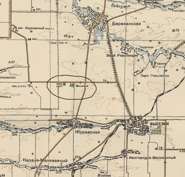На старой довоенной карте я всё-таки нашёл где находился хутор Мазанов (самого генерала Мазанова с барским домом). Наш хутор Мазановский возможно находился немного левее там, где на карте изображен ряд деревьев. Шура Панаиотти на рисунке дома своего деда отметил эти пирамидальные тополя. В настоящее время там поля с кукурузой.