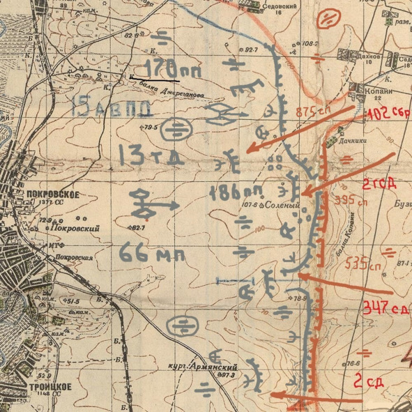 Продолжу про героев донских степей. Наступило лето 1942 года. Полки 339 Ростовской стрелковой дивизии продолжали удерживать восточный берег реки Миус. Наша авиация по ночам на тихоходных самолётах производила бомбардировку районов Неклиновка, Ряжная, Покровского. Пока было затишье штаб армии проводил проверки обороны и выдал оперативную директиву под №00170. В ней были указаны выявленные недостатки, по результатам которых были поставлены задачи, которые необходимо было выполнить. В числе задач было приказано: опорные пункты обороны эшелонировать в глубину, так же широко применять противотанковые и противопехотные препятствия. Требовалось соблюдение маскировки боевых порядков с воздуха. Было указано вывести штабы полков из населённых пунктов в поле и маскировать их.