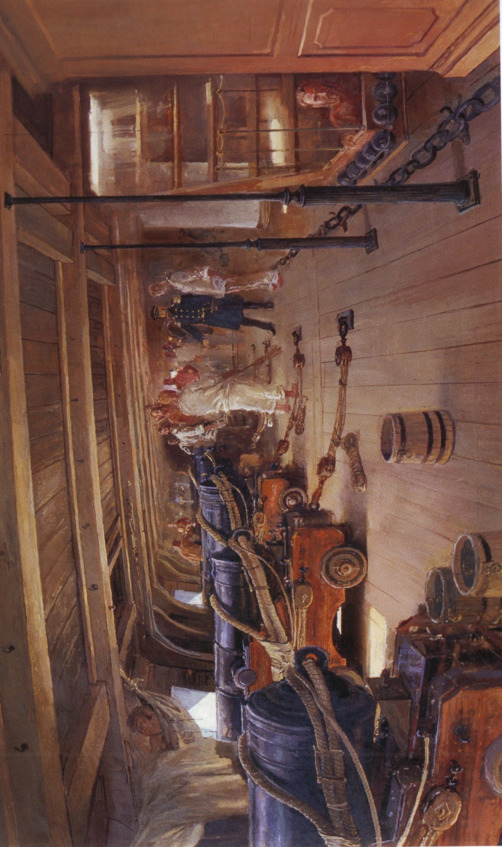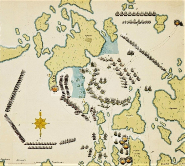 На одном из наших кораблей находился мичман Афанасий Депальдо, который рисовал с натуры все сражения Черноморского флота. Именно эту схему боя с моими пометками расположения «» и пробитыми в многих местах парусами отмеченные Афанасием Никитичем мы видим здесь. Мичман-художник с большой точностью изобразил все повреждения на кораблях. Видимо после боя он собрал сведения. Навархии
