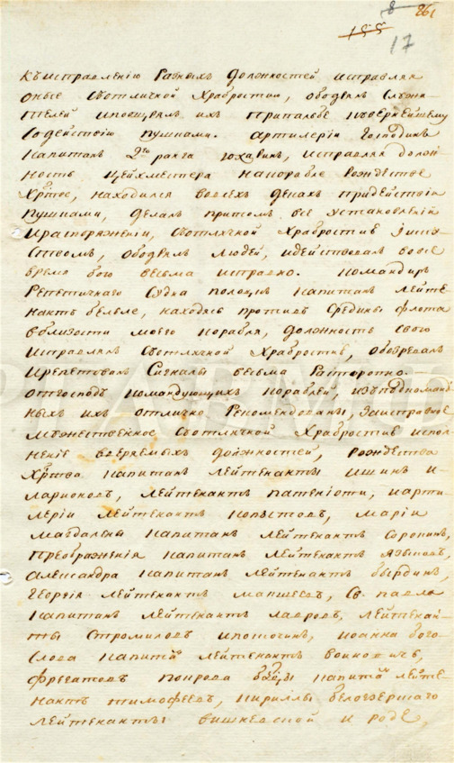 Контр-адмирал Ушаков оказался со своими кораблями первым в построенной линии баталии. За этими 6 кораблями «» выстроилась «» и первым после разворота оказался 46-пушечный «» капитана Дмитрия Сенявина. Он встал за 50-пушечным кораблём «» с капитаном Михаилом Чефалиано. За Сенявиным оказался 46-пушечный корабль «» под командой Ильи Ознобишина и все остальные корабли. За «» выстроились 6 кораблей «» бригадира Павла Пустошкина. Так подробно я описываю построение линии баталии, чтоб довести до читателя расположение корабля Дмитрия Сенявина. Он находился седьмым из 18 кораблей, через 3 корабля после «», где держал вымпел Фёдор Ушаков, это надо запомнить. кордебаталии авангардия Навархия Георгий Победоносец Царь Константин авангардией арьергардии Рождества Христова