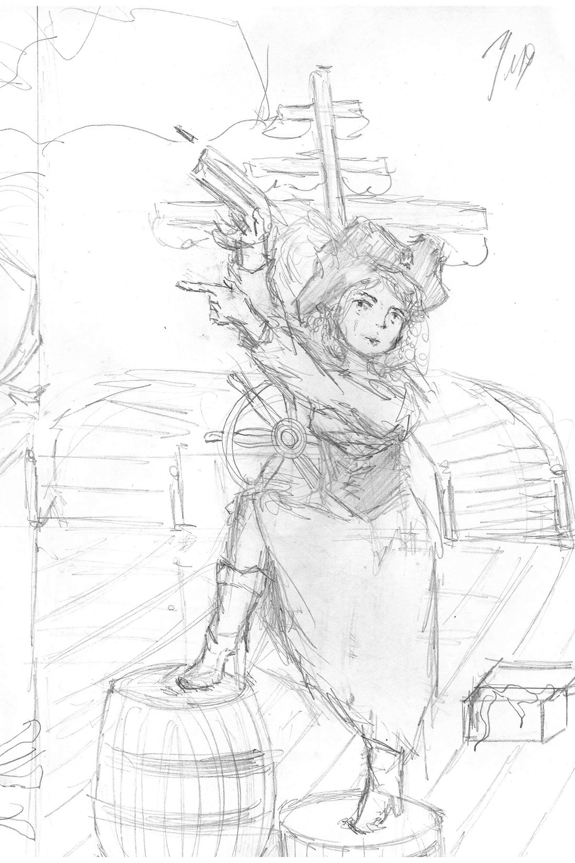 Трюм корабля. Повсюду разбросана одежда. Девушка лет тридцати, сидя на корточках, шарит по раскиданному на полу хламу. Одетая в грубые, простые штаны и такую же кофту, на поясе висят два пистолета.