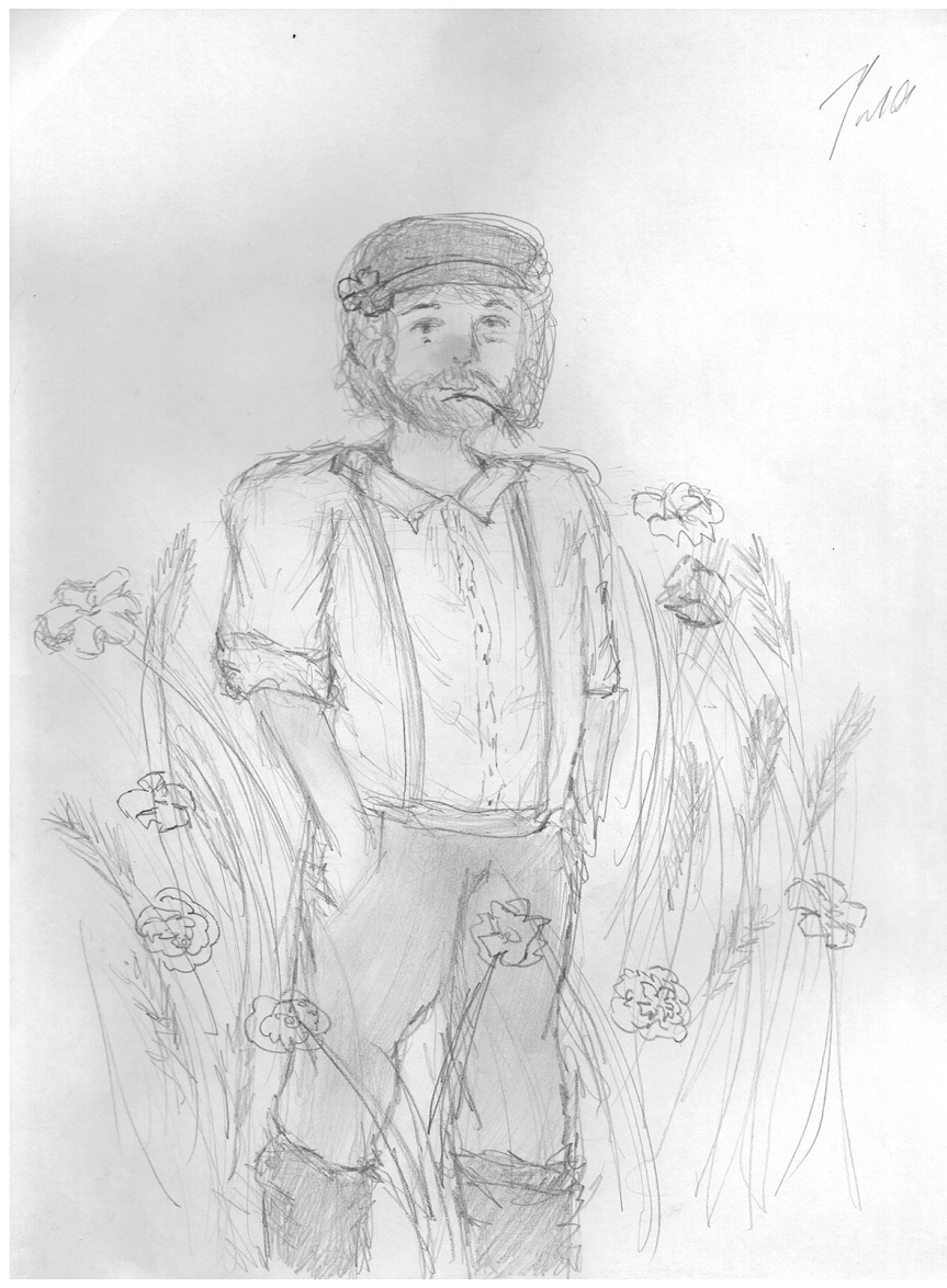 Выхожу на веранду, откуда открывается вид на сад. Облепленная груша, сочные яблочки на высоких деревьях. А в центре сада огромные, почти с человеческий рост, цветы. Они склоняются в разные стороны, кто-то идет. Седые волосы, тяжелая походка вперевалочку. Со стороны, кажется, что это какой-то мишка забрался в сад, чтобы полакомиться сладким медом.