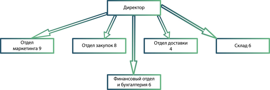 Так устроено природой, что средний порог возможного количества подчинённых в прямом управлении одного руководителя, должен быть не более 7–10 человек. Это «медицинский факт», который описан в большом количестве учебников. Практика строится в полном соответствии с данным правилом. В армии самая маленькая структурная единица состоит из 10 солдат и называется отделением. Им руководит сержант. Небольшое гражданское судно из восьми матросов имеет капитана. Девять научных сотрудников НИИ работают в отделе под началом руководителя проекта. Так организована деятельность практически в любой организации. Если вы внимательно приглядитесь к предложенной схеме, вы увидите, что руководствуясь данным правилом, отдел доставки и склад можно объединить под управлением одного начальника.