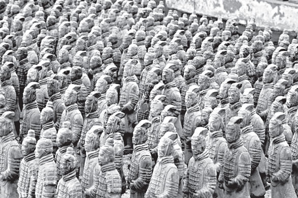 Пожалуй, самое интересное свидетельство обряда похорон связано со знаменитой терракотовой армией в Китае. Терракотовое войско – это армия, состоящая из 7 000 солдат, стрелков, лошадей и повозок в полном боевом снаряжении, созданных в натуральную величину. Войско «охраняло» могилу императора Цинь Шихуанди, первого правителя Китая, с 210 г. до н. э. Терракотовая армия более 2 000 лет находилась под землей, пока в 1974 году не была обнаружена местными крестьянами, копавшими колодец. Терракотовая армия – это памятник огромного исторического значения. Сотни статуй воинов в натуральную величину представляют собой армию, которая в период Сражающихся царств (475–221 гг. до н. э.) одержала победу над всеми остальными китайскими воинствами. Эта победа сыграла решающую роль в формировании единого Китайского государства. Каждый воин обладает уникальными чертами лица, прической, жестами. Всадники, пехота, лучники, носильщики больших луков, старшие офицеры и генералы построены в соответствии с древним боевым порядком.