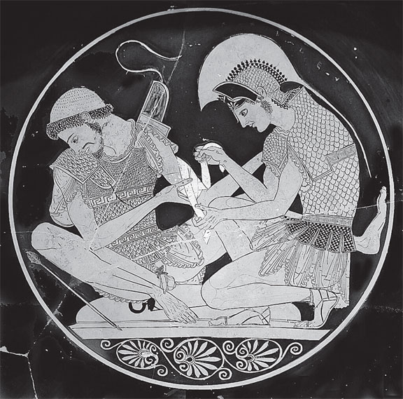 Чаша с изображением Ахилла, перевязывающего руку Патрокла. 500 до н. э.