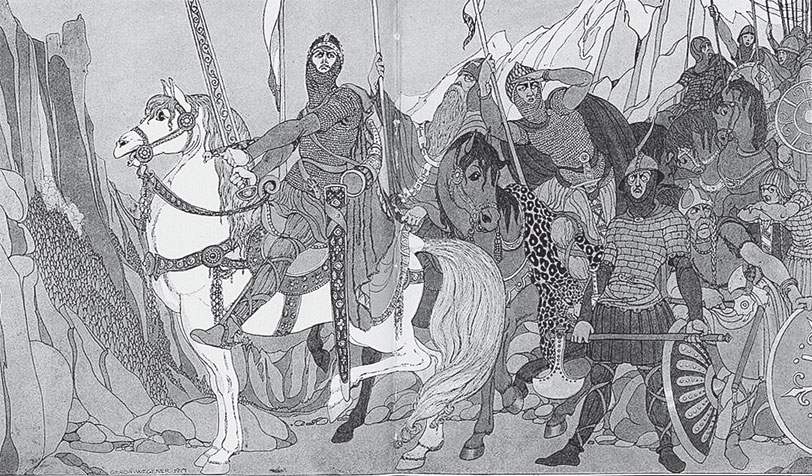 На протяжении нескольких столетий человек Запада будет испытывать восхищение и страх при виде князей войны, восседающих на крупных и сильных животных. Прежде он отдавал должное их изображениям в языческих захоронениях на вересковых пустошах Севера. Теперь – возносит их на алтарь, превратив в св. Георгия и св. Мартина. Юный и наивный Парцифаль, заслышав из глубины дремучего леса звон рыцарского оружия, на первых порах полагает, что все это бесовское наваждение. Но затем, увидев воинов-всадников во всем их великолепии и могуществе, проникается уверенностью, что перед ним ангелы, посланные самим господом. Он падает ниц. Парцифаль обожествляет их и в то же время постигает свою собственную сокровенную сущность и призвание, перевернувшеевсю его жизнь».