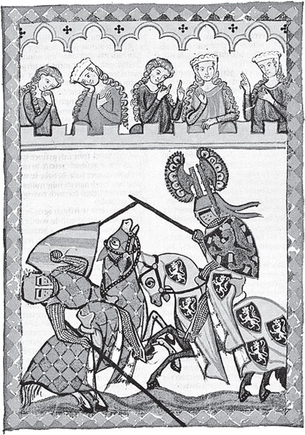 Хронист Нитгард так описывает состязания отрядов Людовика Немецкого и его брата Карла Лысого, проводившиеся в середине IX века: «Для телесных упражнений они часто устраивали воинские игры. Тогда они сходились на особо избранном с этой целью месте, и в присутствии теснившегося со всех сторон народа большие отряды саксов, гасконцев, австразиев и бретонцев бросались быстро друг на друга с обеих сторон; затем одни из них поворачивали своих лошадей и, прикрывшись щитами, искали спасения в бегстве от напора врага, который преследовал бегущих; наконец, оба короля, окруженные отборным юношеством, кидались друг на друга, уставив копья вперед, и, подражая колебанию настоящей битвы, то та, то другая сторона обращалась в бегство. Зрелище было удивительное по своему блеску и господствующему порядку: так что при всей многочисленности участвовавших и при разнообразии народностей никто не осмеливался нанести другому рану или обидеть его бранным словом, что обыкновенно случается даже при самом малочисленном сборище и притом состоящем из людей, знакомых друг с другом».
