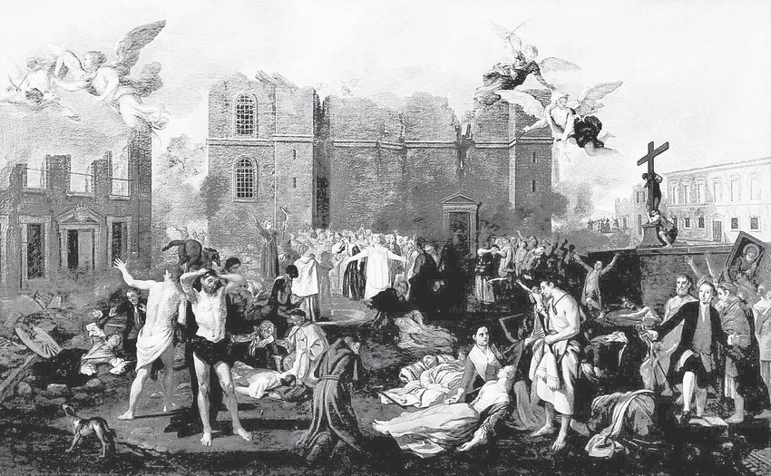 Огонь одновременно появился в трех местах города. В пылающий костер превратился монастырь святого Франциска с его библиотекой в 9 тысяч томов. Бумага горит очень хорошо и это лишь усиливало пламень. От монастыря святой Клары, где нашли приют более 600 монахинь, уцелели только часть алтаря и кафедра. Полыхала приходская церковь святого Юлиана, в которой находилось тогда около 400 человек. Более 300 улиц и 5 тысяч домов сравнялись с землей, от них не осталось никаких следов.
