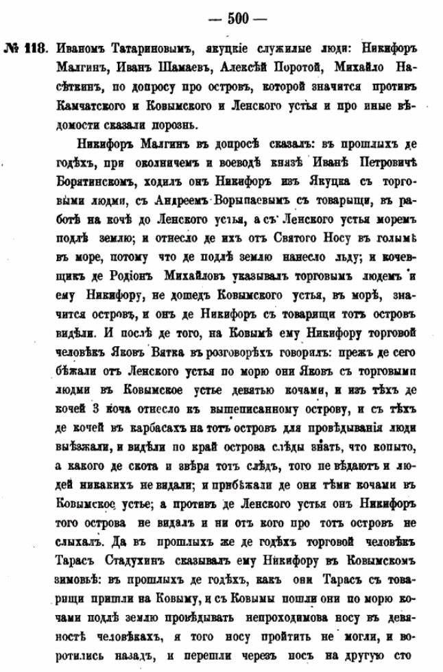 Никифор Малгин в допросе сказал: в прошлых де годех, при околничем и воеводе князе Иване Петровиче Борятинском, ходил он Никифор из Якуцка с торговыми людми, с Андреем Ворыпаевым с товарищи, в работе на коче до Ленского устья, а с Ленского устья морем подле землю; и отнесло де их от Святого Носу в голыме в море, потому что де подле землю нанесло льду; и кочевщик де Родион Михайлов указывал торговым людем и ему Никифору, не дошед Ковымского устья, в море, значится остров, и он де Никифор с товарищи тот остров видели. И после де того, на Ковыме ему Никифору торговой человек Яков Вятка в розговорех говорил: преж де сего бежали от Ленского устья по морю они Яков с торговыми людми в Ковымское устье девятью кочами, и из тех де кочей 3 коча отнесло к вышеписанному острову, и с тех де кочей в карбасах на тот остров для проведывашя люди выезжали, и видели по край острова следы знать, что копыто, а какого де скота и зверя тот след, того не ведают и людей никаких не видали; и прибежали де они теми кочами в Ковымское устье; а против де Ленского устья он Никифор того острова не видал и ни от кого про тот остров не слыхал. Да в прошлых же де годех торговой человек Тарас Стадухин сказывал ему Никифору в Ковымском зимовье: в прошлых де годех, как они Тарас с товарищи пришли на Ковыму, и с Ковымы пошли они по морю кочами подле землю проведывать непроходимова носу в девяносте человеках, и того носу пройтить не могли, и воротились назад, и перешли через нос на другую [501] сторону; и сделав кочи, подле море ходили до Пенжинского устья, и немирных людей громили, и взяли у тех иноземцов в полон одну бабу. И против де Пенжинского устья значится остров и земля видеть. И у той де бабы он Тарас с товарищи про тот остров спрашивали, и та де баба им сказала, что на том острову есть люди бородатые, платье носят долгое, а руских де людей называют братьями. А они де Тарас с товарищи на том острову не были и пошли назад; и иноземцы де неясачные товарищей его Тарасовых, 81 человека, побили, а осталось де их от побоища толко 9 человек, и пришли они на Ковыму.