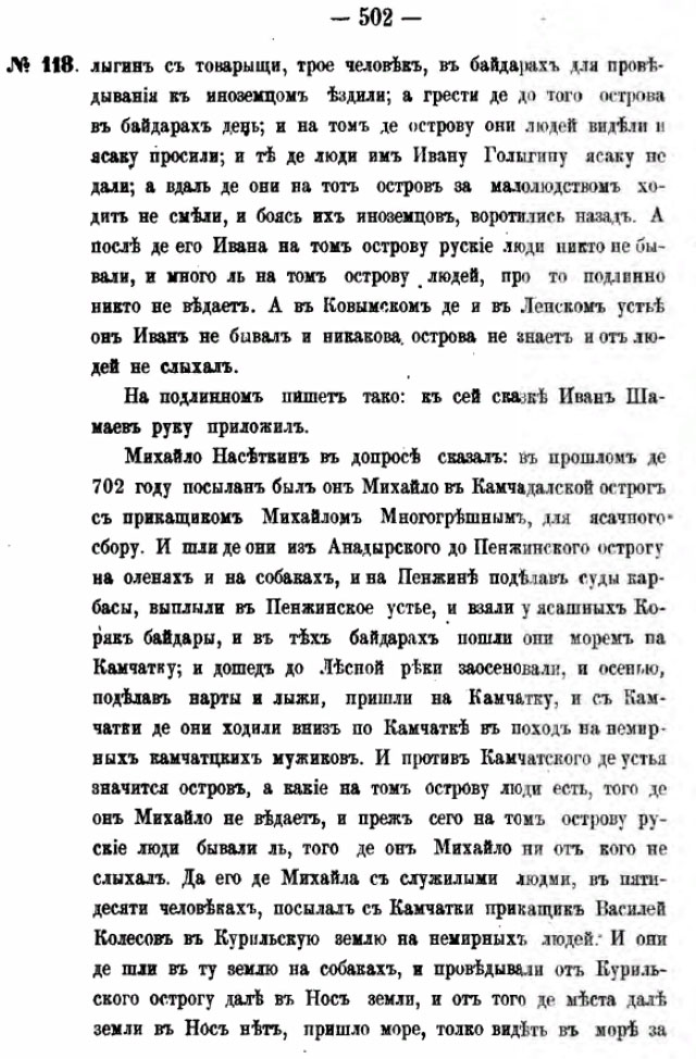 Михайло Насеткин в допросе сказал: в прошлом де 702 году посылан был он Михайло в Камчадалской острог с прикащиком Михайлом Многогрешным, для ясачного сбору. И шли де они из Анадырского до Пенжинского острогу на оленях и на собаках, и на Пенжине поделав суды карбасы, выплыли в Пенжинское устье, и взяли у ясашных Коряк байдары, и в тех байдарах пошли они морем на Камчатку; и дошед до Лесной реки заосеновали, и осенью, поделав нарты и лыжи, пришли на Камчатку, и с Камчатки де они ходили вниз по Камчатке в поход на немирных камчатцких мужиков. И против Камчатского де устья значится остров, а какие на том острову люди есть, того де он Михайло не ведает, и преж сего на том острову руские люди бывали ль, того де он Михайло ни от кого не слыхал. Да его де Михайла с служилыми людми, в пятидесяти человеках, посылал с Камчатки прикащик Василей Колесов в Курильскую землю на немирных людей. И они де шли в ту землю на собаках, и проведывали от Курильского острогу дале в Нос земли, и от того де места дале земли в Нос нет, пришло море, толко видеть в море за [503] переливами земля; а проведать де той земли не на чем, судов морских и судовых припасов нет и взять негде, потому что де лесу близко нет и снастей и якорей взять негде. И идучи де он Михайло назад с Камчатки из Анандырского с прикащиком Михайлом Многогрешным с плотбища судами выплыв по Ковыме в море, и морем в Индигирское устье, и от Ковымского де устья до Индигирки остров в море видеть. А кочевщик де Семен Монастырской сказывал ему Михайлу и служилым людем, что тот остров и земля одна, что с Камчатки от Пенжинского моря и против Ковымского и Ленского устья, а люди де на том острову против Ковымского и Ленского устья какие живут ли, того де он Семен им никому не сказывал и ни от кого он Михайло про людей на том острову не слыхал.