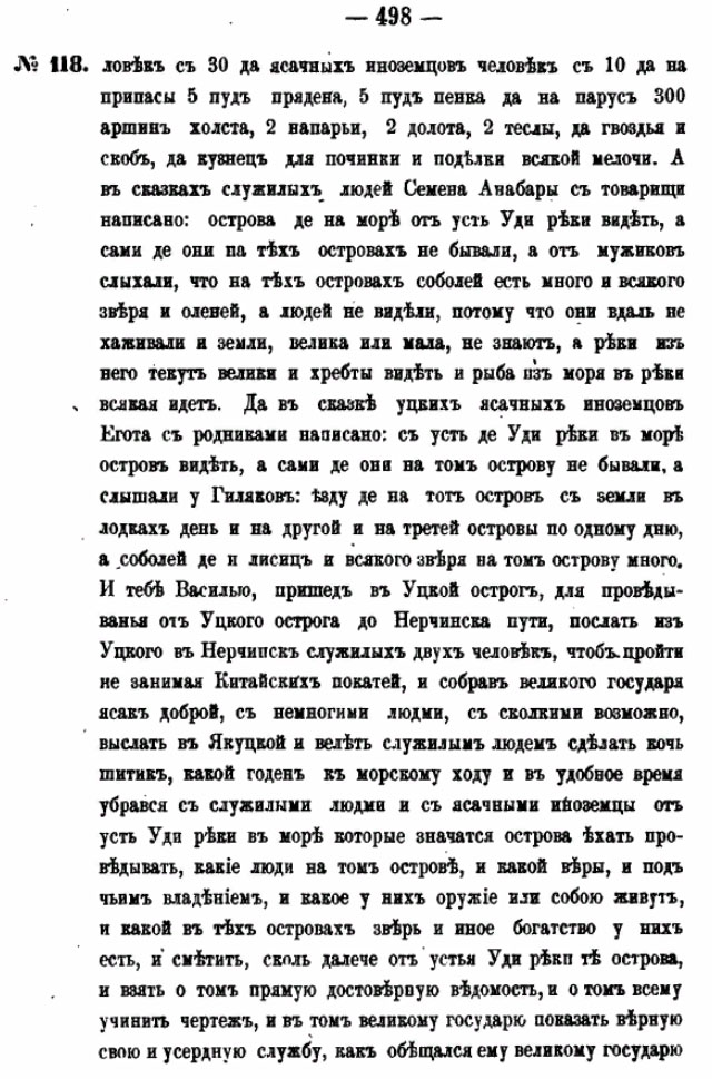 Об исследовании островов против устьев рек: Уди, Камчатки, Ковымы, Лены и Яны1709 году, августа в день, по указу великого государя царя и великого князя Петра Алексеевича, всеа Великия и Малыя и Белыя России самодержца, удскому прикащику Ивану Сорокоумову с служилыми ехать из Якуцка по особому своему наказу, каков ему дан из приказной полаты, за якуцкою великого государя печатью, до Удского острогу с великим поспешением, чтоб того пути снегом не одержало, и дорогою до Уцкого [494] Якутам и Тунгусам никакой и в подводах обиды не чинить; а приехав на Удь, чинить о всем по тому вышеописанному особому наказу. А о недособолях промышлять и радеть с великим попечением, и сверх ясаку такие недособоли у иноземцов менять на крашенину и на олово; а ему Ивану на те недособоли на мену дано из приказной полаты великого государя казны 20 фунтов олова в тарелех, да 30 аршин крашенины. А от усть реки Уди в море которой значится остров проведывать: какие люди на том острове и какой веры и под чьим владеньем, или собою живут, и какой в том острове зверь и иное какое богатство у них есть, и по прямому свидетелству буде возможно какими судами самому с служилыми людми съездить и сметить, сколь далече от устья Уди реки тот остров, и взять о том прямую достоверную ведомость, и о том всем учинить чертеж и в том великому государю показать верную и усердную свою службу, как обещался ему великому государю служить, при своем в Якуцком отпуске, пред святым Христовым евангелием, за что можешь получить от Господа Бога мздовоздаяние, а от великого государя по своей верной услуге многую пред своею братьею милость. А будет кто из служилых людей великому государю против вышеписанного службу свою явит, и тем служилым по его великого государя указу, переменены будут в дворянские чины и учинена будет денежная и товарная многая милость и жалованье. А буде ты с служилыми людми против вышеписанного великого государя указу, за своими прихотми, или для какой своей безделной корысти, не исправишь, и тебе и служилым людем, по указу великого государя, учинено будет жестокое наказанье и пожитки ваши все взяты будут на великого государя бесповоротно. И тое прямую ведомость и чертеж, за своею и служилых людей руками, и иноземцов за их знаменами, привезть в Якуцкой в 710 году.