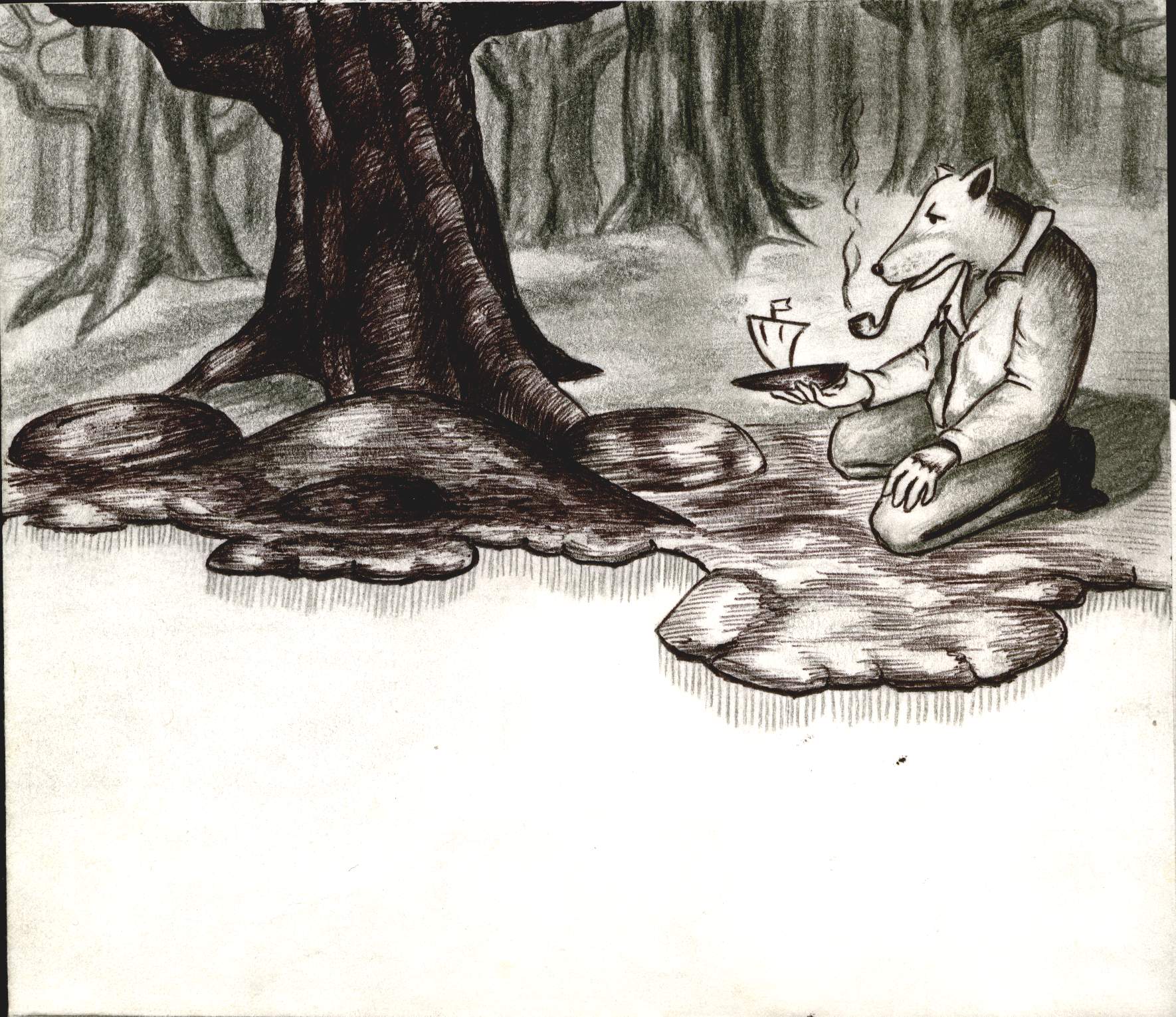 И вдруг опять все умолкло. В лесу стало тихо, как в могиле. Я перестал грести и, осмотревшись, подумал: «Щас ка-а-к вылезет какая-нибудь тварь». Но все было подозрительно спокойно, только ночное эхо донесло издалека: «Чик-брик». И опять все смолкло. Я насторожился. Вновь впереди, но уже ближе: «Брик-чик». Как будто бы кто-то что-то скоблил. «Все ясно, – думаю. – Какая-нибудь зверюга точит свои клычища. Или лопает кого-нибудь всухомятку.» И тут я увидел, кто это был. На левом берегу на пеньке сидел Волк. Он строгал из коры лодочку, размером примерно с пол его головы, и было слышно, как он что-то мурлычет себе под нос. «Чик-брик», – скрипел перочинный ножик. «Брик-чик», – разносилось в тишине. Волк настолько был увлечен своим делом, что не замечал ничего вокруг. Он то подносил кору к самым глазам, то смотрел на нее издали, видать проверял, ровно ли выстругивается. Затем опять беззаботно продолжал свое занятие.