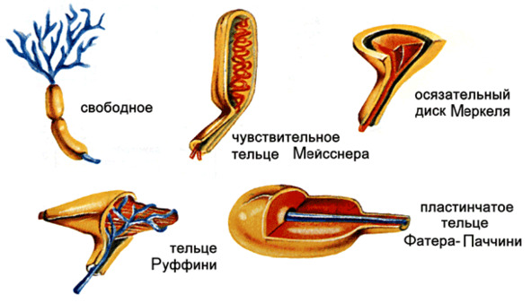 За восприятие прикосновения отвечают другие рецепторы – тельца Мейснера. Они располагаются в глубоком сосочковом слое кожи. Но не только тельца Мейснера участвуют в процессе «понимания» прикосновений. Этим занимаются свободные окончания нервных волокон мелких сосудов, тонкие нервные волокна волосяной сумки. На кистях рук и пальцах волосяной покров редкий, или его совсем нет. При этом эти части тела считаются самыми чувствительными и содержат примерно 17 тыс. кожных экстерорецепторов. Механорецепторы с наличием малых рецепторных полей и медленной и быстрой формами адаптации больше всего накоплены в кончиках пальцев (100 на кв. см). Плотность уменьшается уже в средних фалангах пальцев. Дело в том, что корковые представительства кончиков пальцев обладают большей площадью. Пальцы чаще используют для исследования предметов тактильным способом. Наиболее обильное содержание рецепторов отмечается в губах и языке.