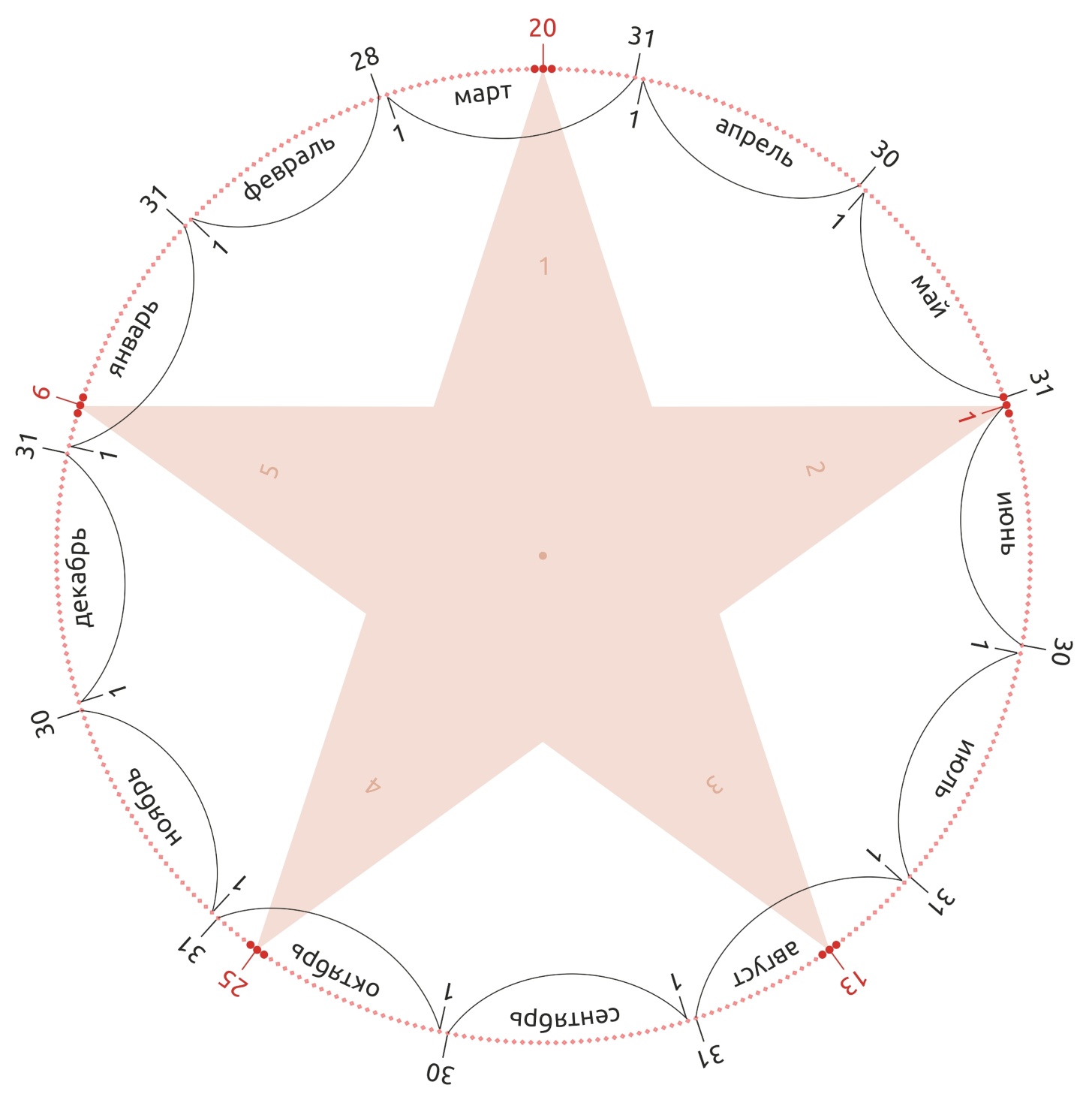Дополнительно отметим ещё несколько моментов. Даты проведения ритуалов по пятиконечной Звезде Ярилы: