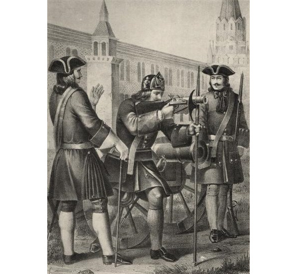 Офицер, бомбардир, фузилер в 1712—1720 гг. Литография Л. А. Белоусова из книги «Историческое описание одежды и вооружения российских войск». 1842 г.