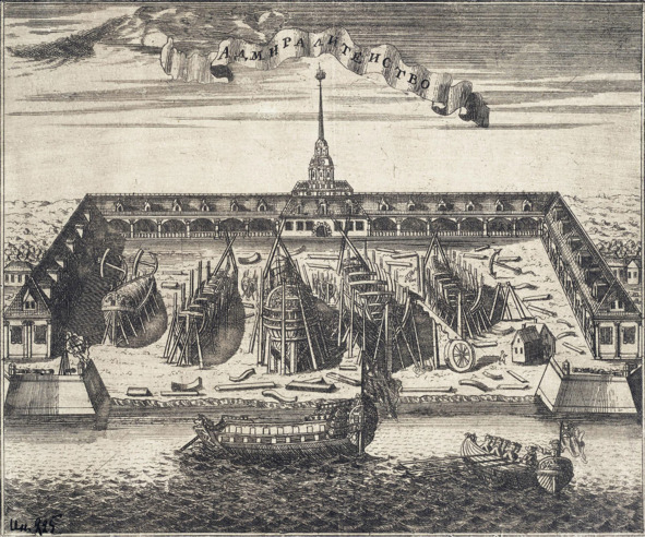 Санкт-Петербургское адмиралтейство. Гравюра А. Ф. Зубова. 1716 г.