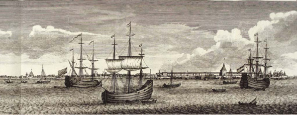 Панорама г. Архангельска. Гравюра К. де Брюина из книги «Путешествие через Московию в Персию и Индию». 1711 г.