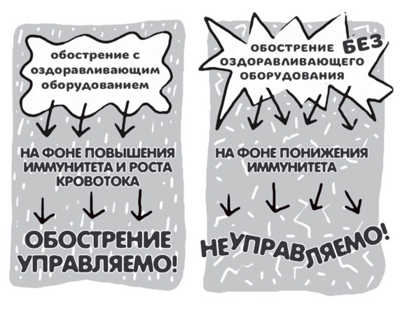 Как избежать ярких обострений, как пройти через обострение? Обострение хронической болезни – явление абсолютно нормальное, но им нужно научиться управлять. Можно ли сочетать применение оборудования и прием классических препаратов от давления, от воспаления и т.д.? Можно, абсолютно без каких-либо ограничений! Потому что таблетка пытается «придавить» саму болезнь, а оборудование для семейного оздоровления дает организму новые силы, чтобы избавиться от этой болезни самостоятельно. И это две большие разницы. Но пока организм еще не очень сильный, чтобы выгнать болезнь, можно принимать таблетки от обострений. Как только организм начинает справляться с болезнями самостоятельно (а это происходит примерно через 1—3 месяца), можно, посоветовавшись с доктором, уходить от приема своих таблеток.