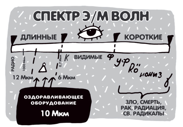 Волны, расположенные по другую сторону видимого спектра, за красным концом минимального спектра, – это инфракрасные волны и радиоволны. И чем дальше к левой стороне спектра, тем больше длина волн. Весь спектр инфракрасных волн занимает от 0,7 до 1000 микрометров (мкм). Человек также излучает инфракрасные волны, но в более узком диапазоне – от 6 до 2 мкм, его и называют биорезонансным.