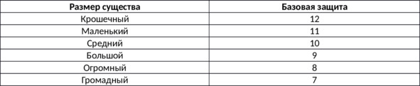 Бонус/штраф размера (БШР): размер, отличный от Среднего, может быть выгоден в одних ситуациях и мешать в других. Небольшому существу легче прятаться и избегать от ударов (это учитывается в его Базовой защите), а крупному – хватать и удерживать противника.