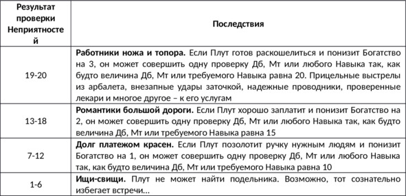 Хорошие друзья плохого парня: Плут оброс множеством сомнительных знакомств, но некоторые из них могут принести реальную пользу. Плут может задействовать свои связи там, где может встретиться со своими бывшими (и нынешними) подельниками. Применение способности в бою требует Быстрого действия. Совершите проверку Неприятностей:
